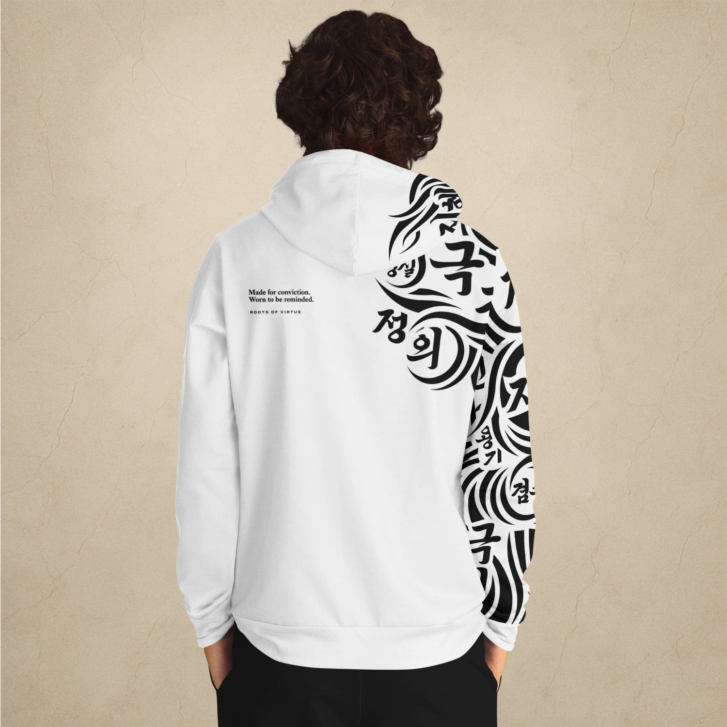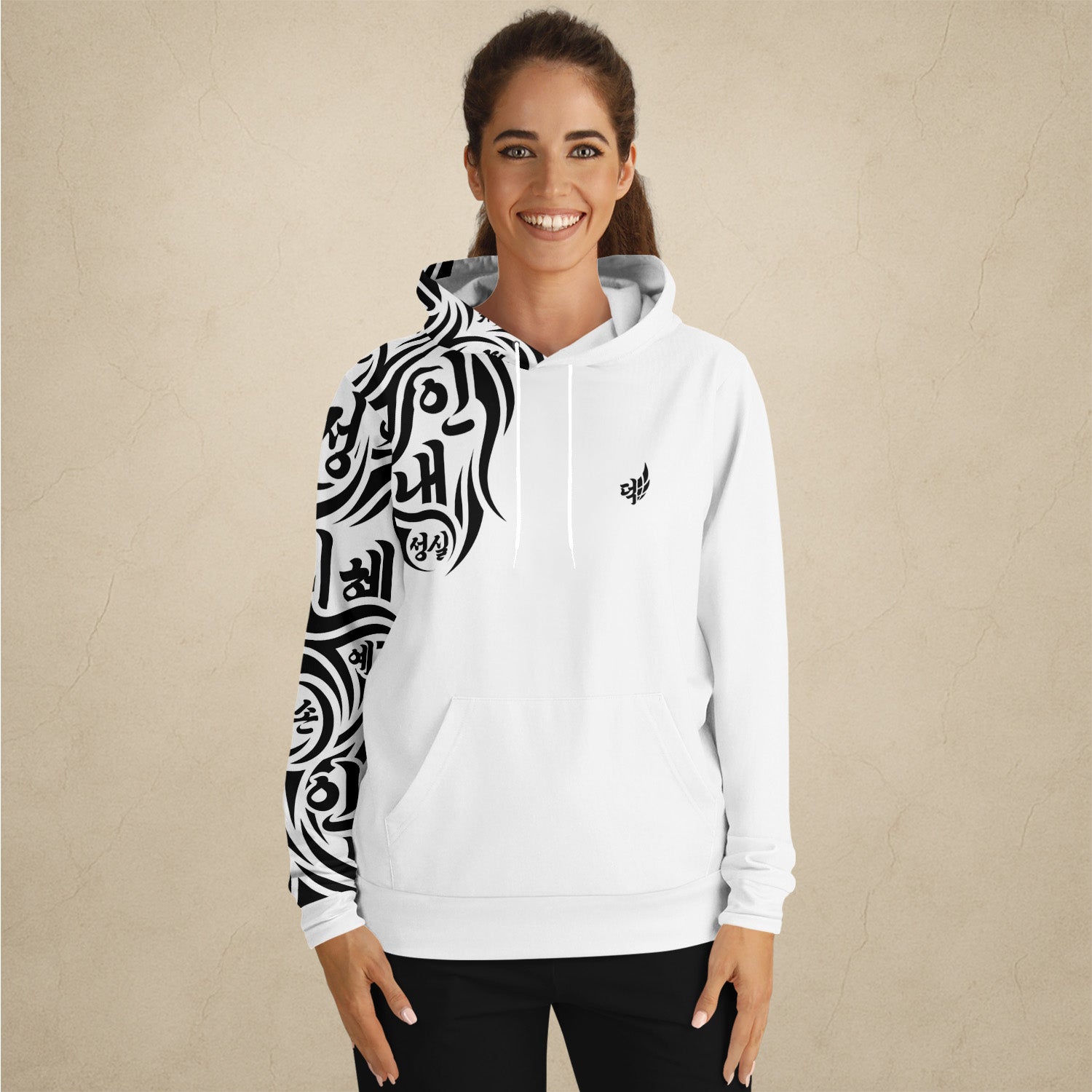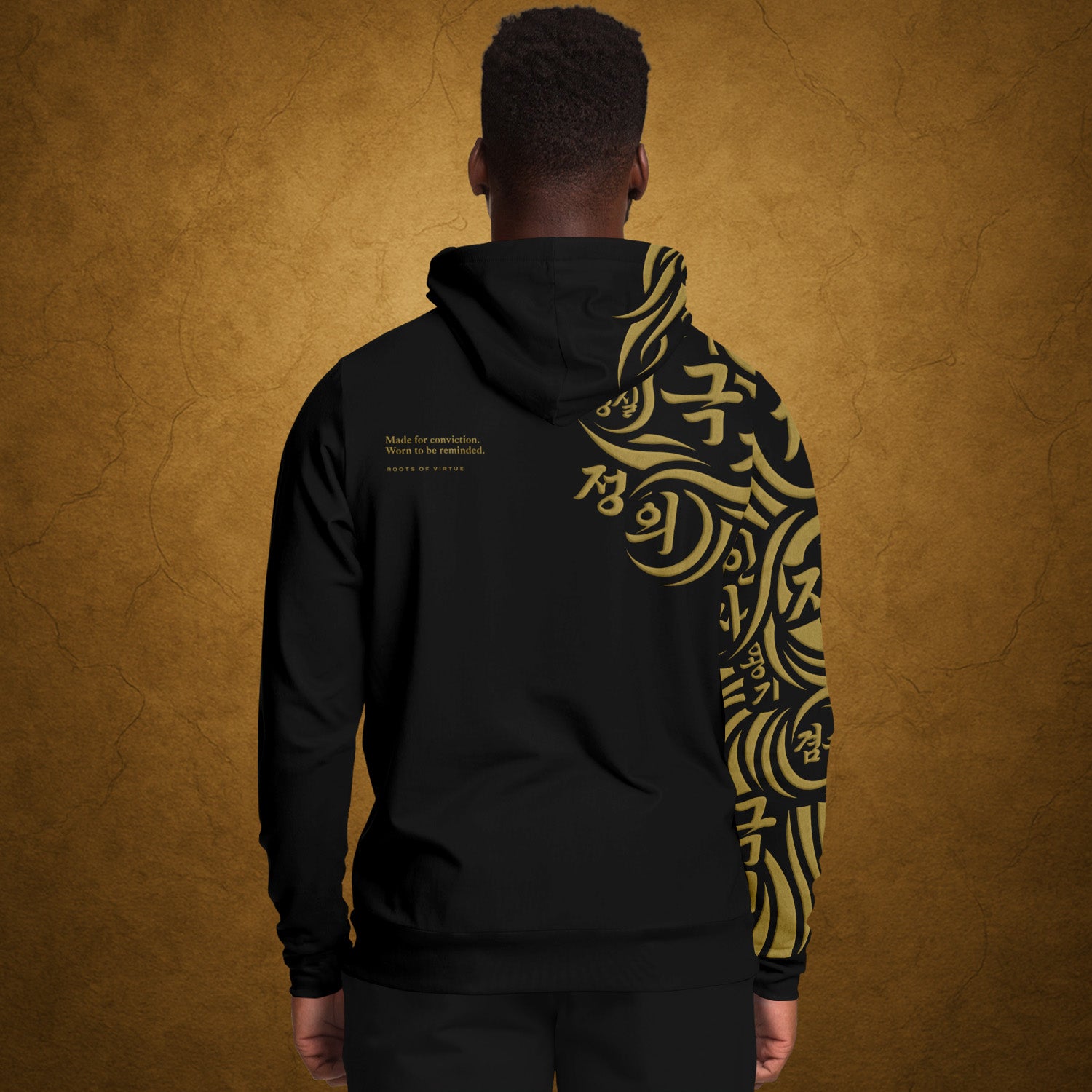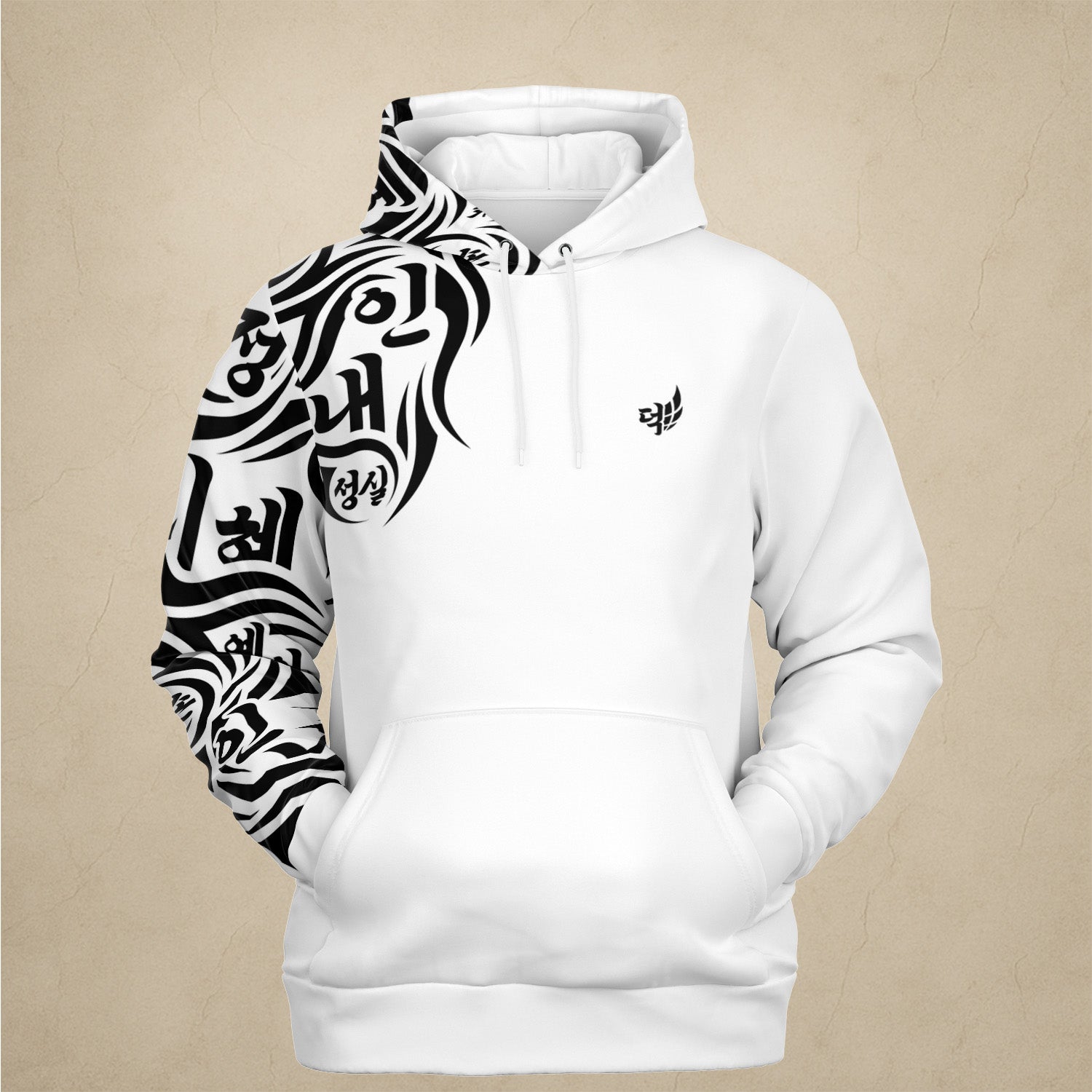 덕 auf der Brust – das koreanische Schriftzeichen für „Tugend“.