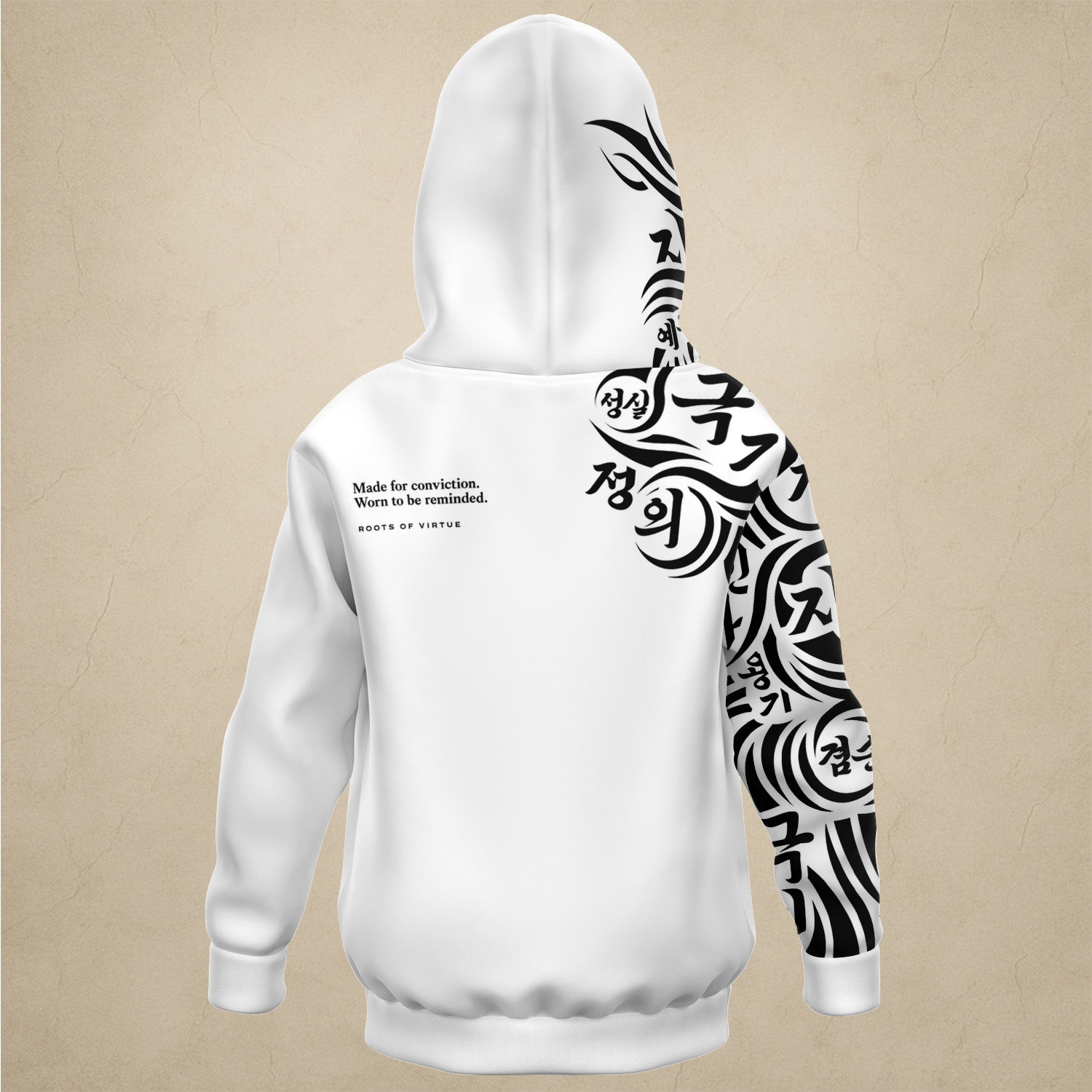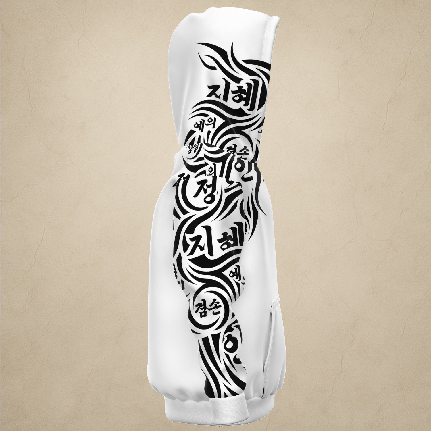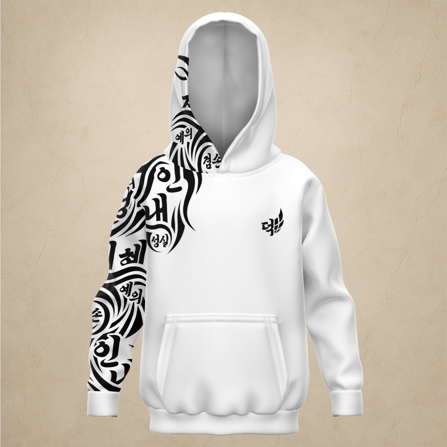 덕 auf der Brust – das koreanische Schriftzeichen für „Tugend“.